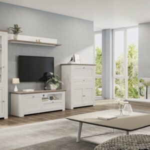 Az összeállítás tartalmazza: 1 db Komód, 1 db Vitrin, 1 db TV szekrény, 1 db falipolcot.